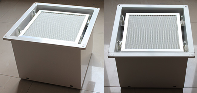 高效送風口不是傳統(tǒng)意義上的散流器送風口或百葉送風口,它是由冷軋板或不銹鋼板制作,冷軋鋼板表面經噴塑或烤漆處理,制作成的一個靜壓箱體,上面有吊環(huán)、螺桿、或螺母(為壓緊高效過濾器使用),進風口法蘭、靜壓箱內壁貼有保溫材料,